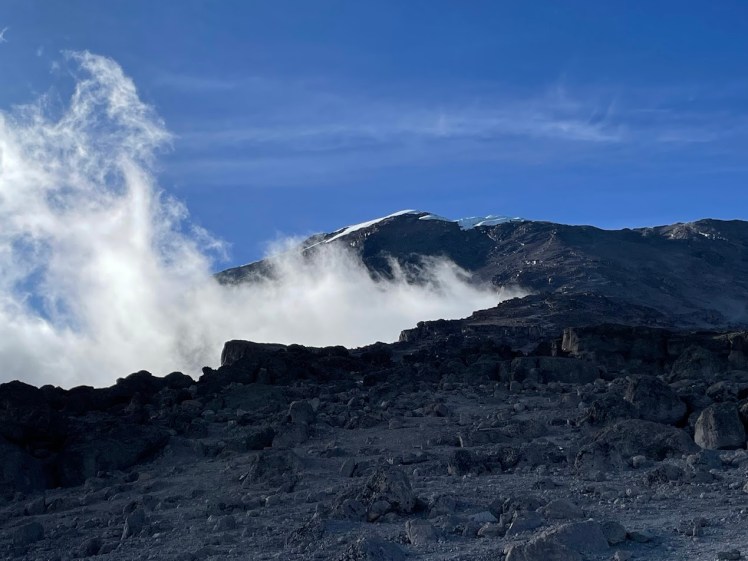 By the time we left camp shortly after nine, most of the people summitting today were already on their ways back down. I didn’t envy them hiking in this wind. Shortly after leaving camp, we heard a huge collective shout. When we turned back, we saw a tent sailing thirty feet above the camp.